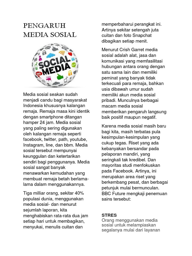 Tiga platform media sosial paling populer di kalangan remaja adalah youtube (digunakan oleh 85 persen remaja, menurut survei bagaimana penggunaan media sosial dapat meningkatkan risiko kesehatan mental remaja? Remaja masa kini identik dengan smartphone ditangan hamper 24 jam. Media sosial seakan sudah menjadi candu bagi masyarakat indonesia khususnya kalangan remaja. Mengurangi penggunaan media sosial merupakan cara yang tepat untuk menghilangkan sifat kecanduan. Media sosial merupakan media komunikasi pada jaringan internet.